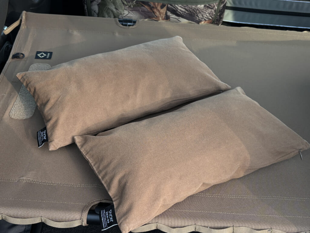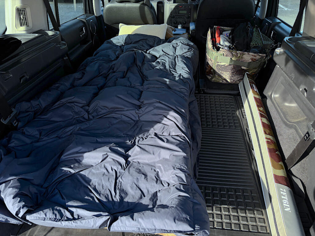 個人的には、釣りや遠出の際の車中泊用に、ひとつ常備しておくとかなり使えそうだなと思いました。キャンプコットをちょうどスッポリ覆ってくれるくらいのサイズ感なので、冬以外なら寝袋いらず。真冬は寝袋と組み合わせて使えばどんな寒さにも対応してくれそう。