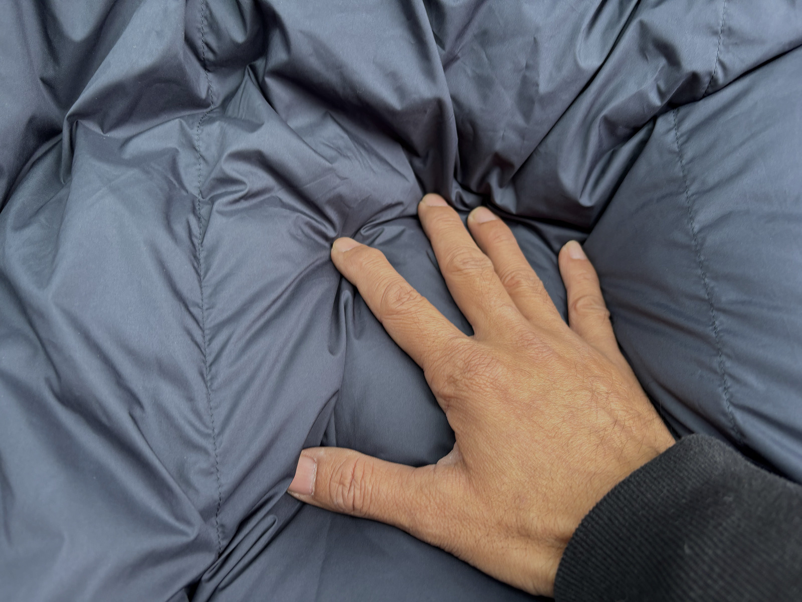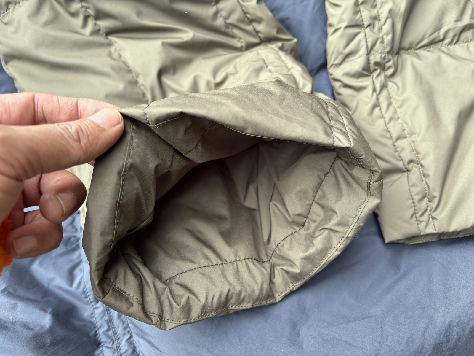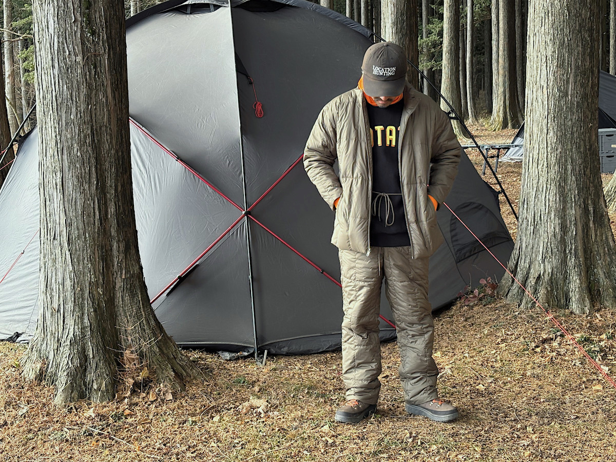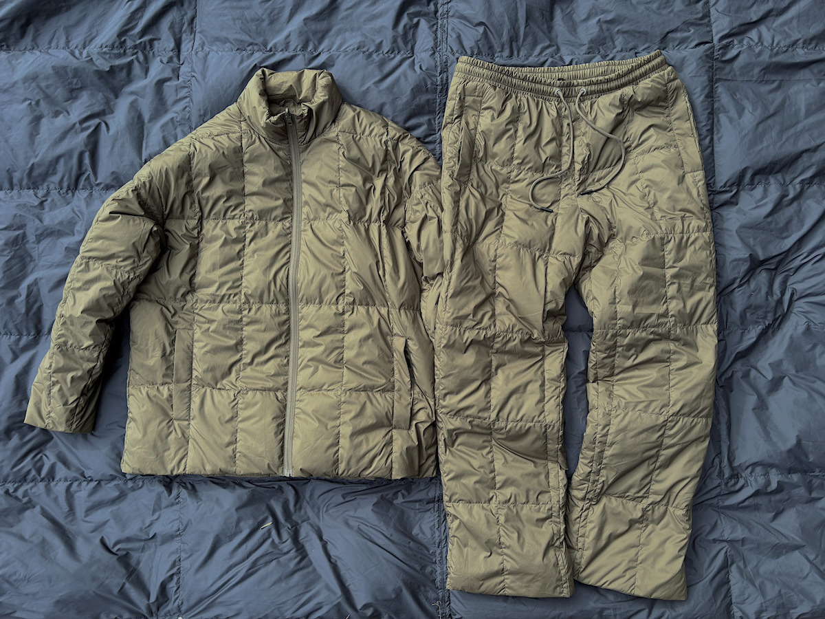 一見、変哲のないダウンセットアップのように見えるけれど……実際に着てみて思わずうなずいてしまいました。ひとことで言うと、前述の羽毛布団を着ているような感覚(こちらも800FPの高級ダウン使用)。軽く、着用しているのにカラダ全体をふわっと覆われているかのような、一切の締め付けがありません。