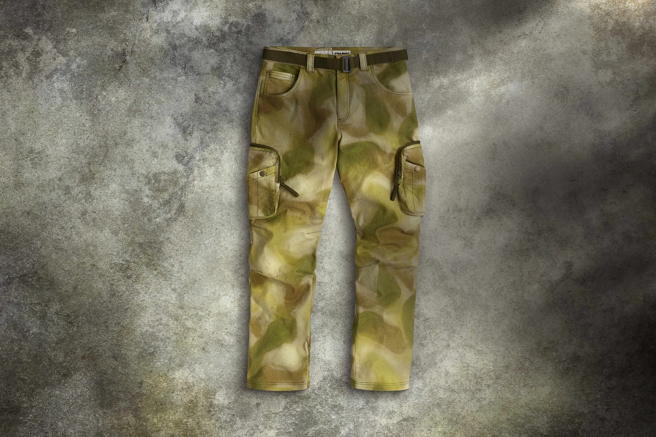 ポンチョと同様の「Surplus Green Camo」で仕上げたカーゴパンツは、ヒザ周りの立体的なパターンやファスナー付きのポケットなどでユーティリティも上々。