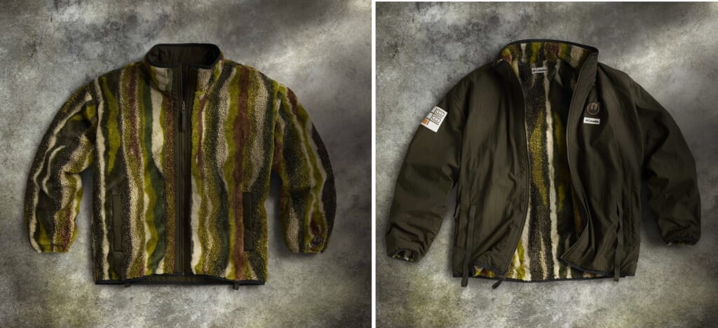 2 WAYで着用できるリバーシブル仕様。エンドアの雰囲気を彷彿とさせるフォレスト柄はフリース素材、そして深いオリーブ柄は撥水機能を持たせた“オムニシールド”で使い分けられる。もちろん両面に反乱軍の紋章を取り入れつつ、デイジーチェーンなどのディテールも◎。