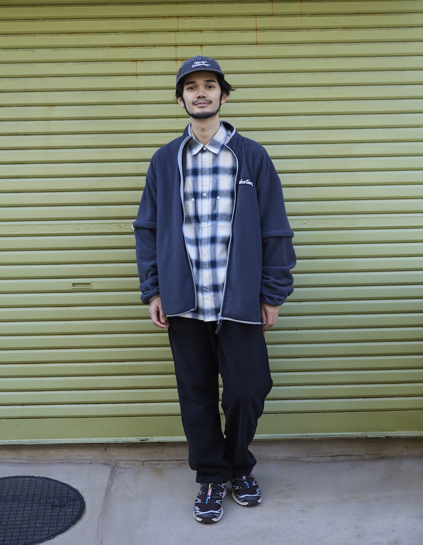 ソフトな質感のフリースウエアで上下をまとめつつ、ラフになりすぎないようにシャツをセレクト。トップスは袖が取り外せる特別仕様で、インナーとして使えるのも魅力的。