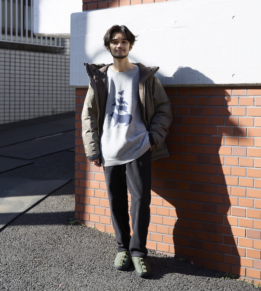 ダウンジャケットとフリースパンツでのリラックスしたスタイルのインナーをニットにして、外出もOKな着こなしに。落ち着いたトーンで統一し、大人っぽい雰囲気になった。