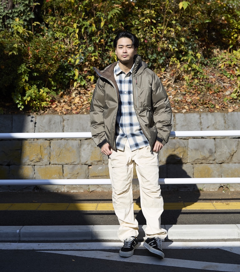 ダウンジャケット+ネルシャツ+フリースパンツ。温もりあふれる3アイテムで着回しにトライ。【買えるGO OUT】