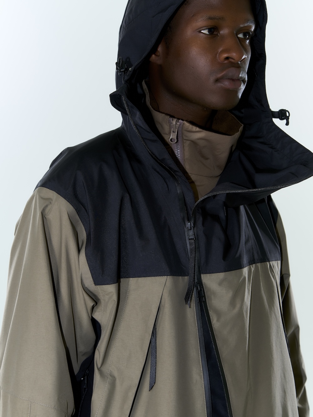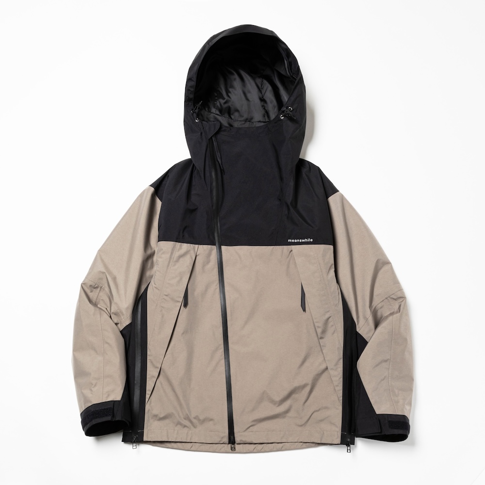 メンブレンの優れた通気性・透湿疎水性が特徴の防水シェルジャケット。モバイルバッテリーのエネルギーを利用し、まるで電気カーペットのような機能性を備えるヒーター機能付き。斜めに配したジップは顎に干渉せず、脇下にベンチレーション、裾にドローコードを配し、シェルとしての機能性も良し。