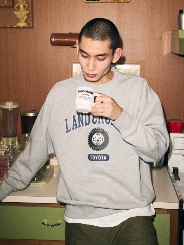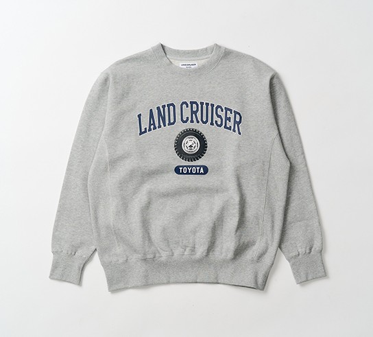何枚でも欲しいプレーンなスウェットは、カレッジ風にアレンジ! とくに中央のホイールはランクル40及び60に採用された輸出用15インチスチールホイール+下駄山タイヤをイメージ。TOYOTAロゴはエンブレム風に仕上げられている。