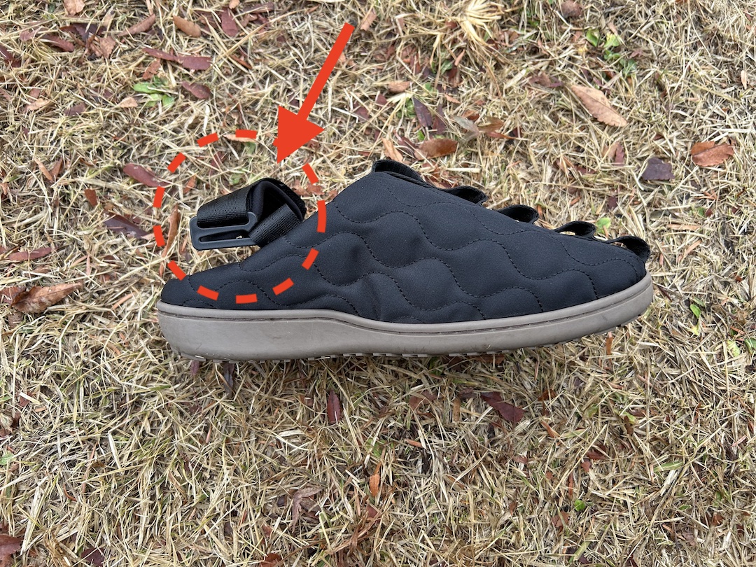 サンダルを履き慣れないため、どうも違和感が。道の途中、思い切っていっぱいいっぱいまでベルトを絞ってみました。好みでしょうが、固定されて楽になりました。ちなみにカカト部分にはクッションパッドがついているので靴擦れの心配もありませんでした。