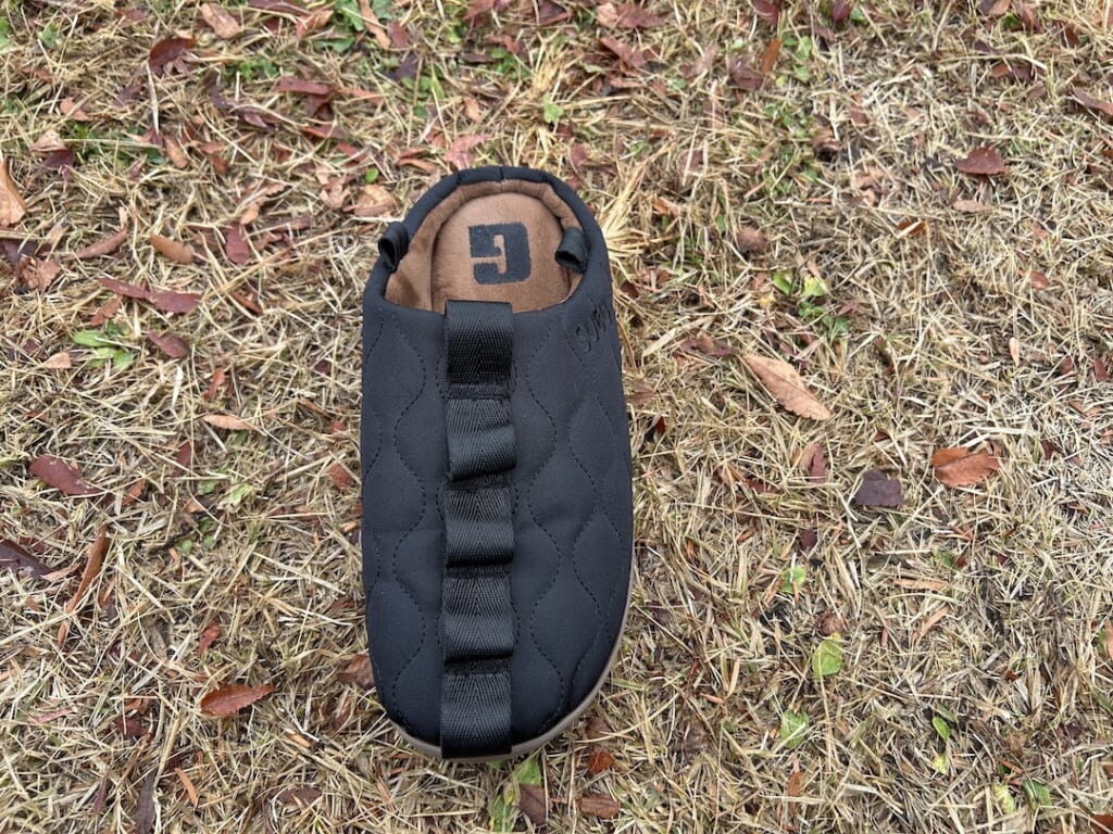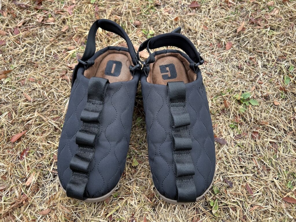 こちらのコラボモデルはヒールベルトがあることでホールド感が一気にアップし、砂利道や段差などもビクともせずにグングン進めるのが魅力。またベルトは着脱式のため、外した状態での着用ももちろんOK。アッパーは過去2回のGO OUTコラボ同様、ひょうたん形キルトを使い、センターにはデイジーチェーンをオン。柔らかなフットベッドにはGとOの文字を左右それぞれに刺繍。カラーソールをチョイスし黒と茶系の2トーンカラーにまとめたので、どんなコーディネートにもマッチします。