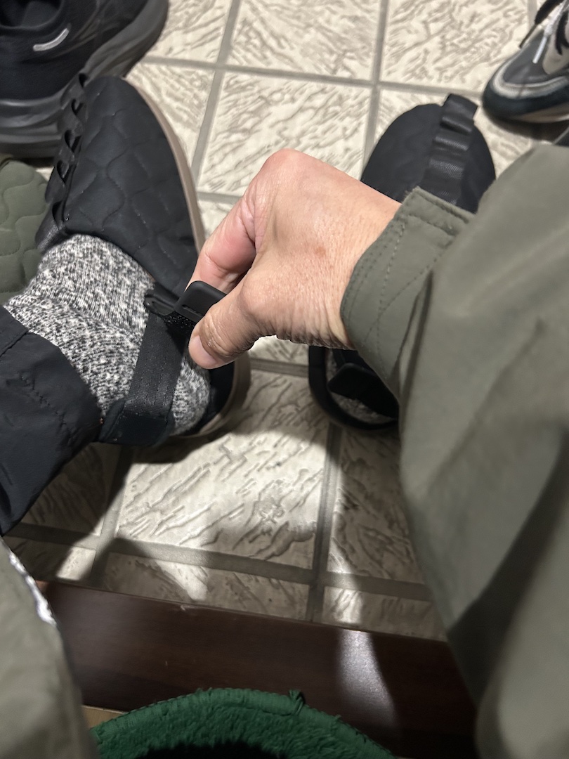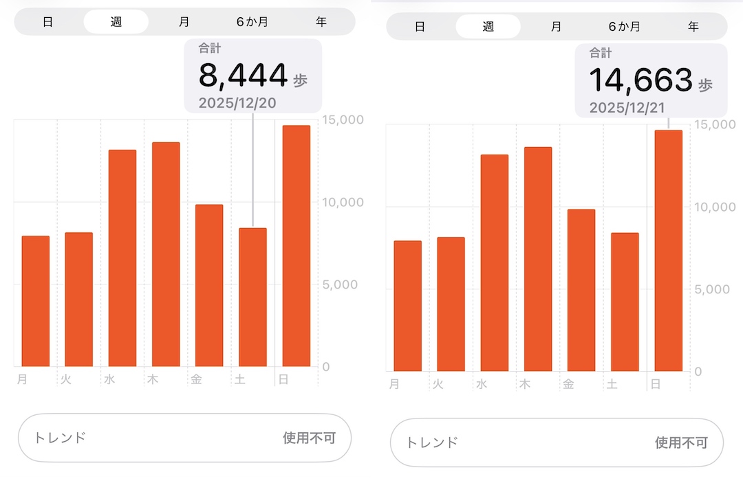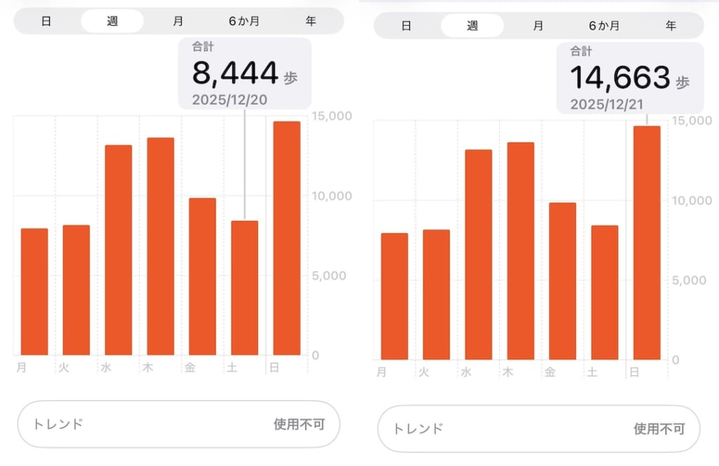 で、実際履いてみた感想ですが、驚くくらい「楽ちん」でした。幾層にも重ねて構築されているフットベッドは柔らかすぎず・固すぎずで、歩くのにピッタリのソフトさ。アッパーの内側も柔らかすぎない素材でそっと甲を包んでくれ、踏み出す足をしっかりサポートしてくれます。カカトのないサンダルだとカパカパして、すぐにふくらはぎが筋肉痛になっていたのですが、ヒールベルトのおかげでそれも全く気にならず。また温かい靴下をチョイスすれば、今冬ならぜんぜんOKではないでしょうか。このように長時間履いていたにもかかわらず楽々歩けたこちらで、週末の2日間でこれだけの歩数となっていました。