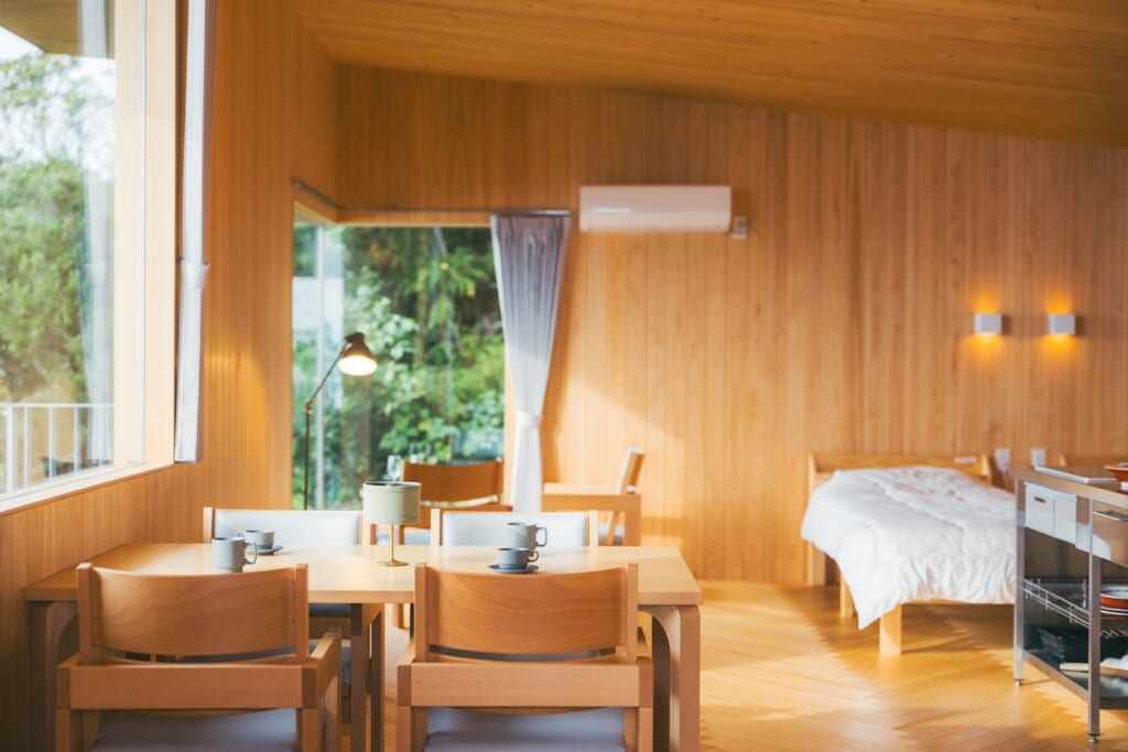 今回、サウナ付きのE-2棟を「フレッシュサービス」仕様にアレンジを加え、カトラリーや食器をはじめ、ゴミ箱、ハンガー、ラグなどのグッズを揃え、宿泊しながら使用できるんです。