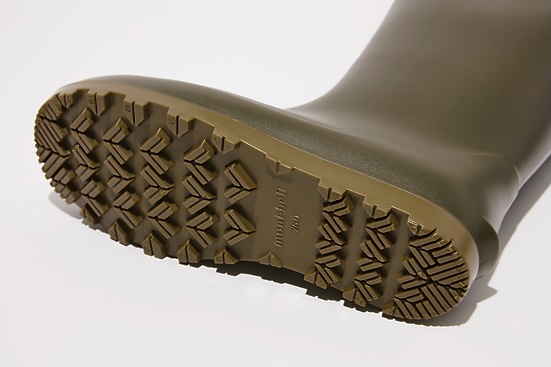 軽量で耐油性のある素材を使用。しなやかな履き心地が特徴で、カフ付きの履き口はドローコードでフィット感を調整可能。ヒールブロック付きで脱ぎやすい。