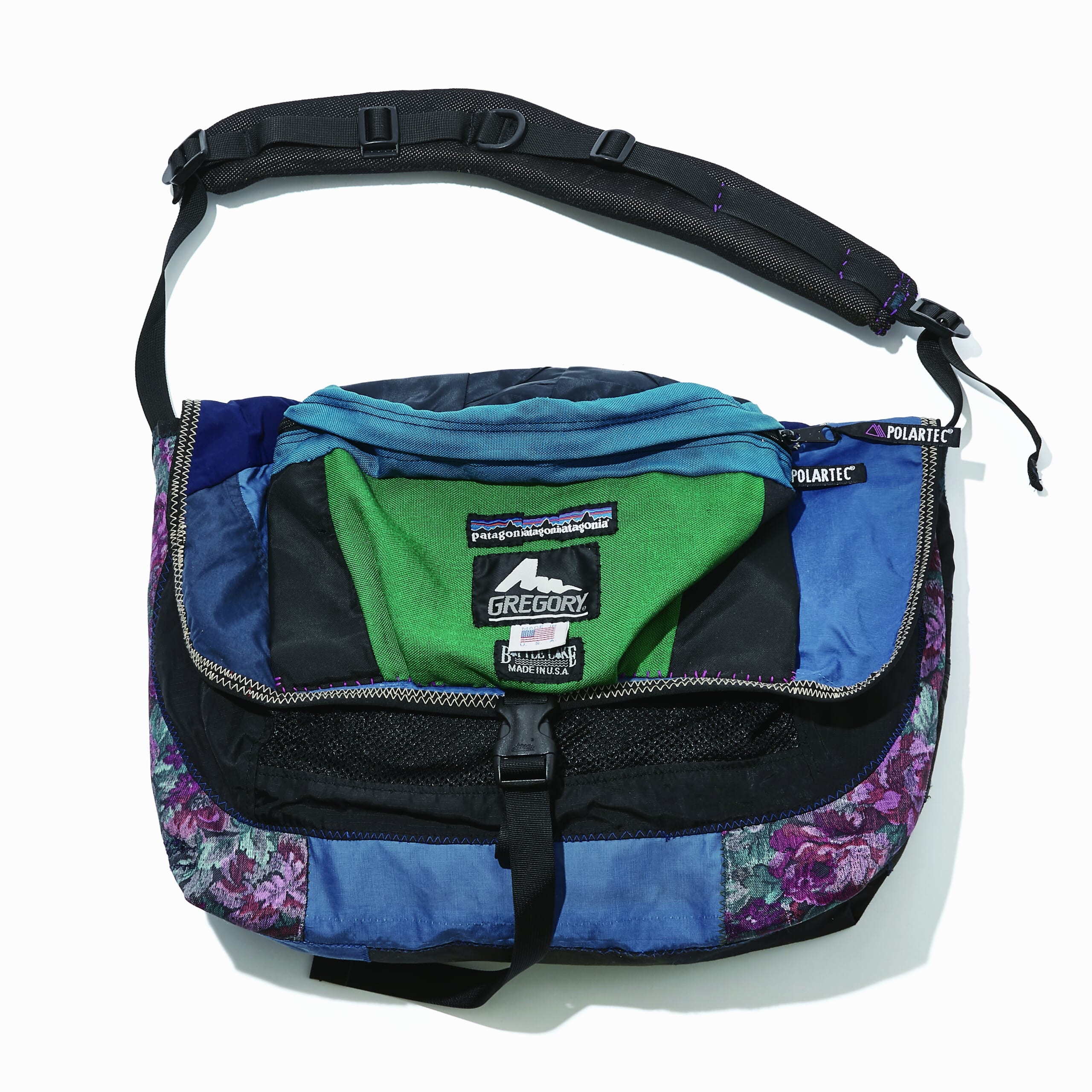 アウトドア系バッグを再構築し、オリジナル刺しゅうやワッペンを施しながら製作したメッセンジャーバッグ。インスタグラムで販売。