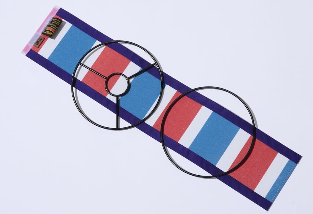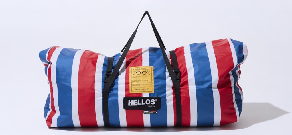 タープながら2本のポールを湾曲させて組み立てるシェルターのようなデザインで、お馴染みのレトロストライプもアクセントになっている。