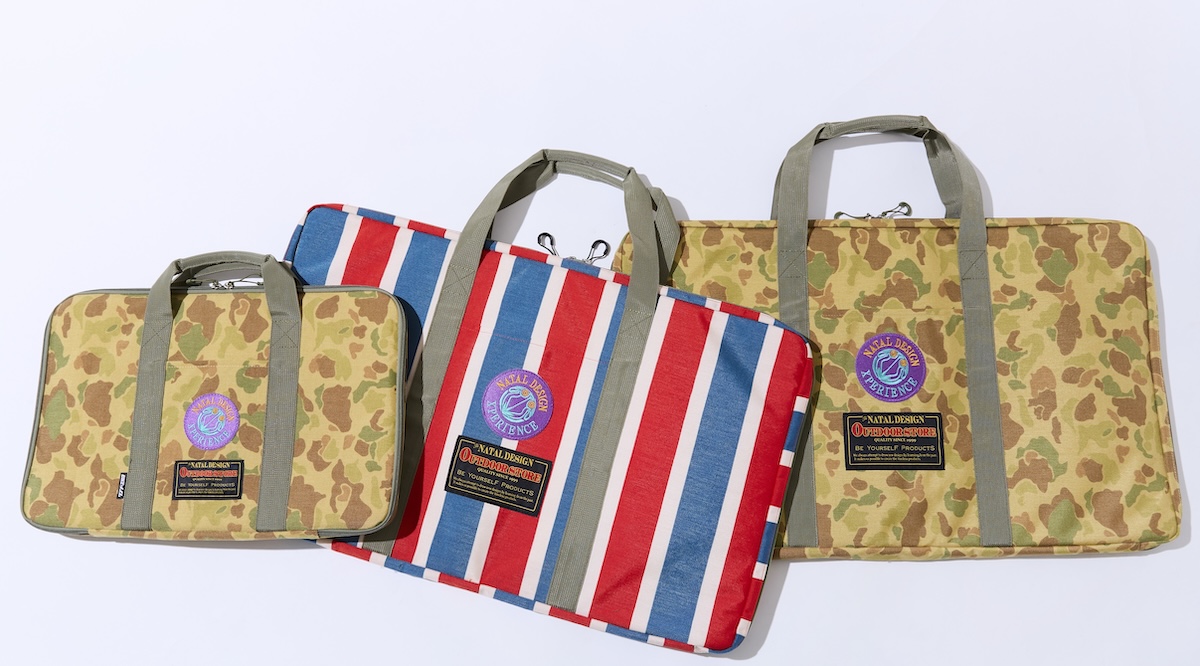 サンゾー工務店の定番ギア、アイアンテーブルの収納ケースを、カモ柄とレトロストライプでアレンジ。テーブルのサイズに合わせた2モデルを展開している。