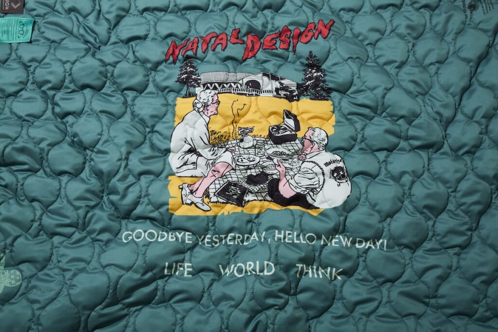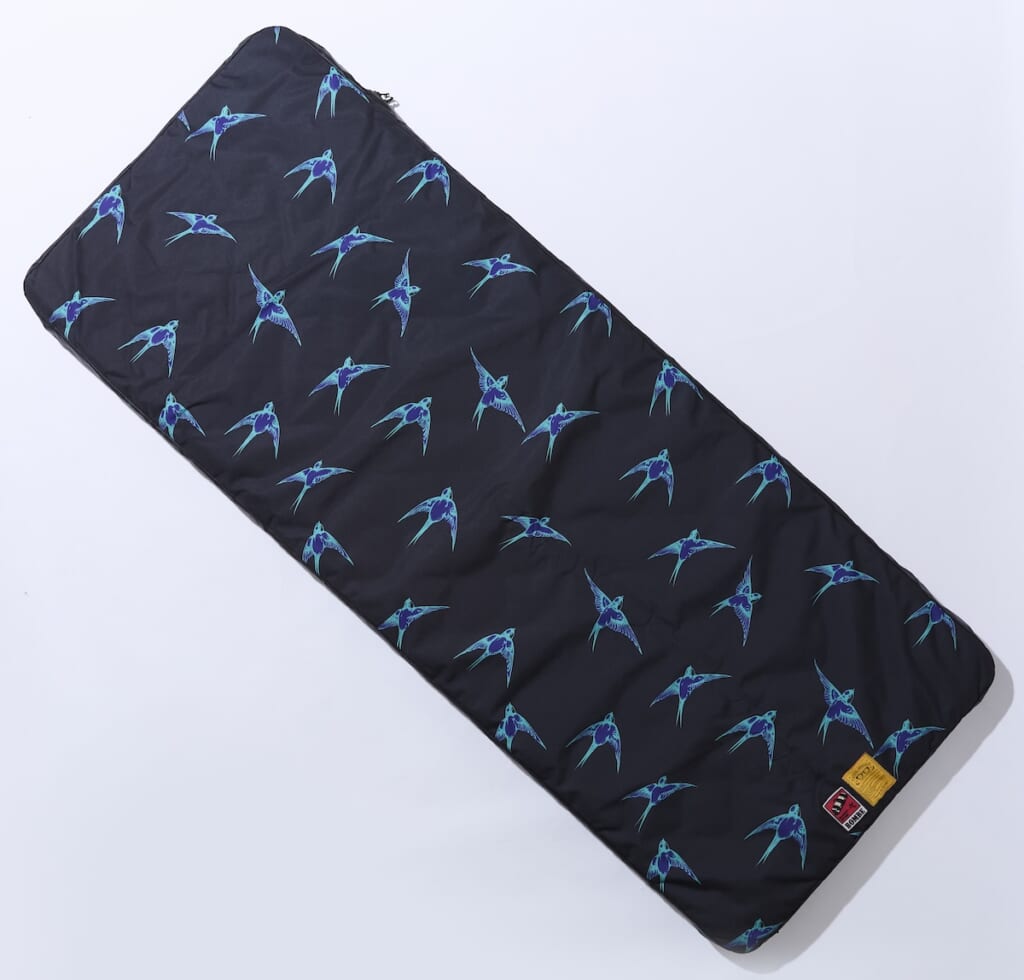 そんな旬なアイテムに、ジェリー鵜飼氏のイラストをプラスした別注モデルがこちら。気軽に野外に持ち出せ、腰に巻いて座ったり、膝掛けに丁度いいSサイズで汎用性も高い。