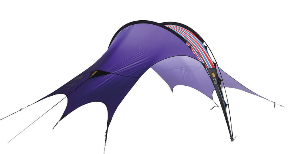 韓国発のテントメーカー、ヘロスファクトリーとコラボレートしてリリースされるドラゴンフライタープは、その名の通り、トンボをモチーフにした独自のシェイプが魅力。