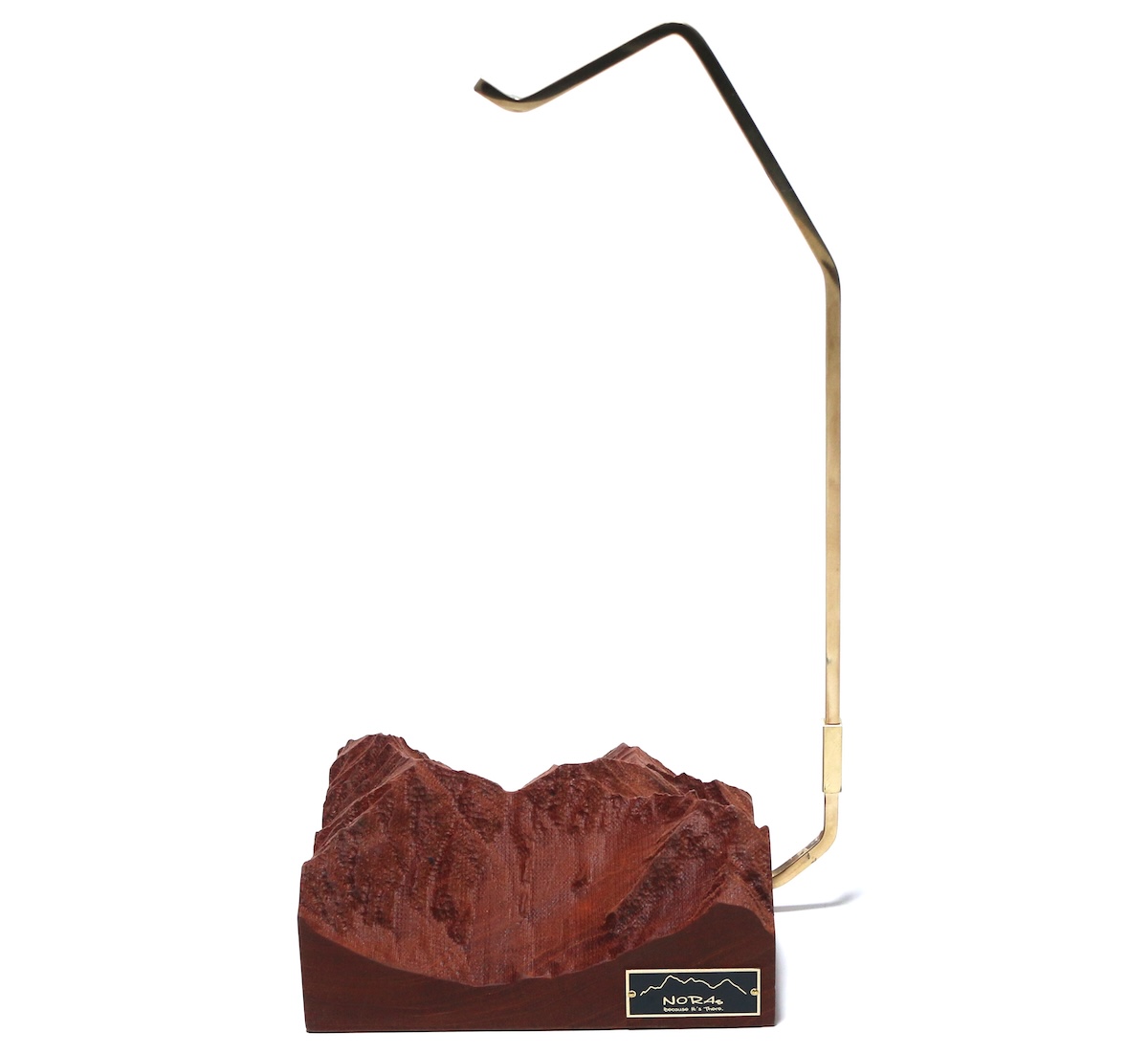 ノラズの発明品ともいえるマウンテンスタンドは、LEDライトをセットして光を灯すことで、台座に削り出された山嶺の陰影が楽しめるという逸品。