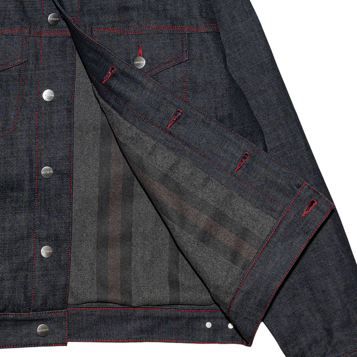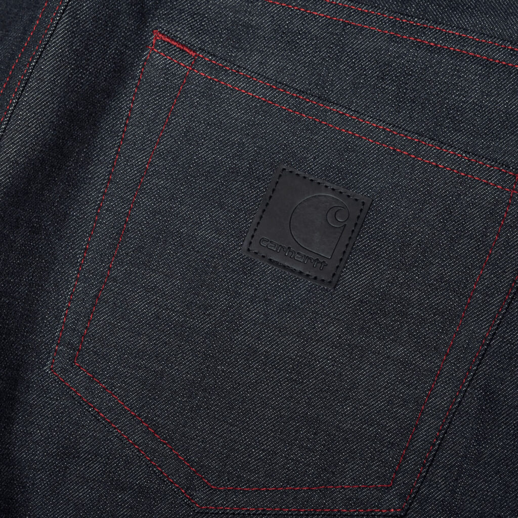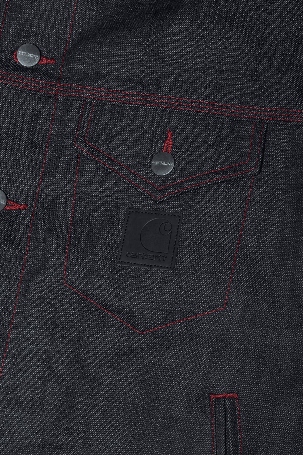 素材は「Carhartt WIP」では数少ない 13.5ozリジットデニムを採用。赤い糸のステッチワークと、胸ポケットに付けられたブラックレザーの「Carhartt WIP」スクエアラベルが全体のデザインを完成させている。