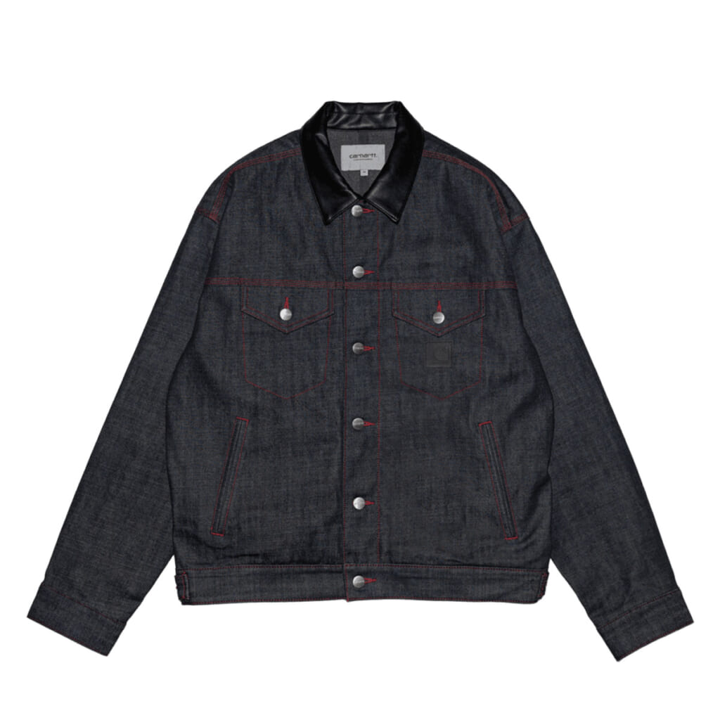 「Carhartt WIP」で以前販売されたジャケット ”Helston Jacket“の型からインスパイアを受けた“Rigid Denim Jacket”を、日本エクスクルーシブ仕様として再構築。チェストとサイドにポケットを配置し、襟の部分は合皮で仕立てられている。