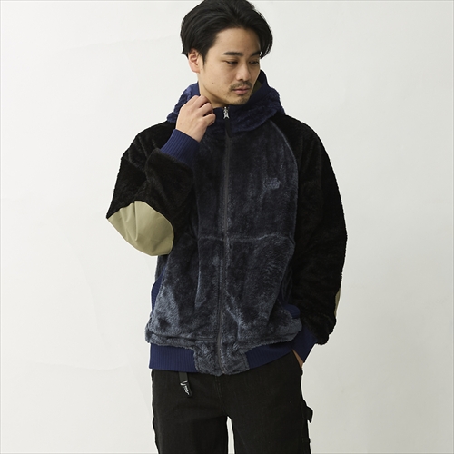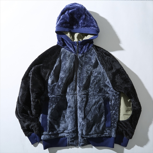 フワフワのボアフリースと滑らかな質感のリップストップ生地。フードタイプのレトロなジャケットをベースとした、表裏で質感の異なる素材を用いたユニークなリバーシブル。