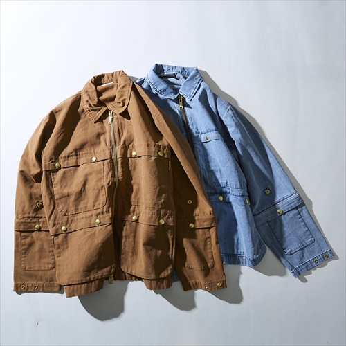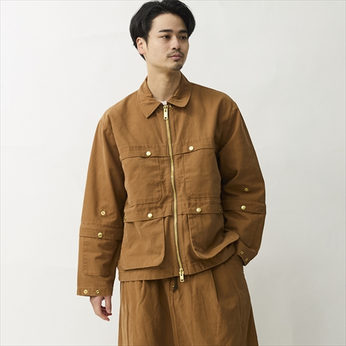 ハンティングジャケットから着想を得たジップジャケットで、ゴールドの金属パーツが目に付くデザイン。アームを取り外せばショートスリーブとしても使える2WAYタイプ。