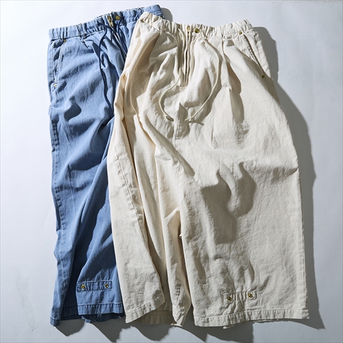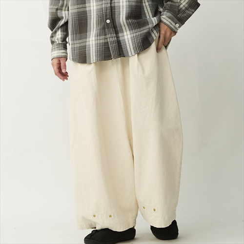 極端に深い股上と裾に向かって広がるスーパーバギーのシルエットに古き良きワークウエアにも使われていた素材を使用し、同ブランドらしい個性的な仕上がりとなっている。