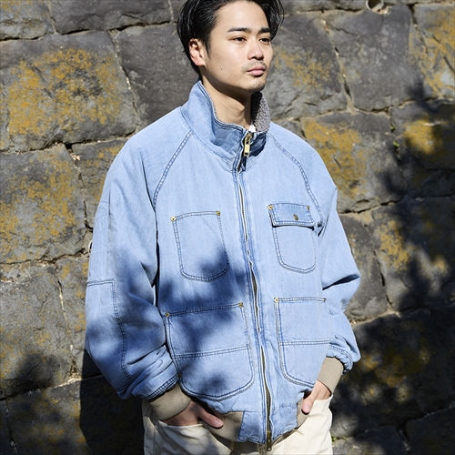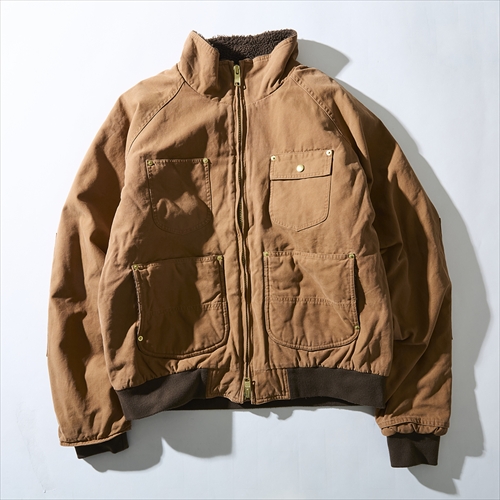 スタンドカラーのワークテイストなデザインで、裏ボアに加えて袖口と裾のリブ使いで保温性が向上。こちらも打ち込んだリベットのゴールドカラーが目に留まる。