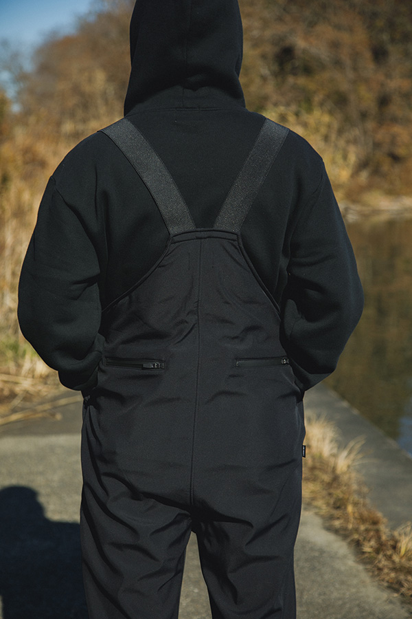 米軍の極寒冷地用被服システム“ECWCS”のアイテムのひとつであるフリースビブを参照し、オリジナルのシルエットへと進化させたワイドシルエットの「ビブパンツ」。腰回りまで深く覆う仕様で、陸っぱりからボートまで冷たい風の侵入をしっかりとガードする。