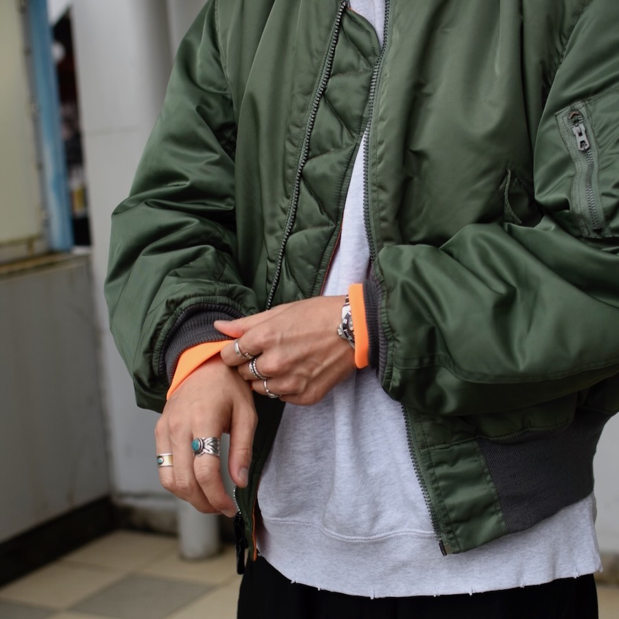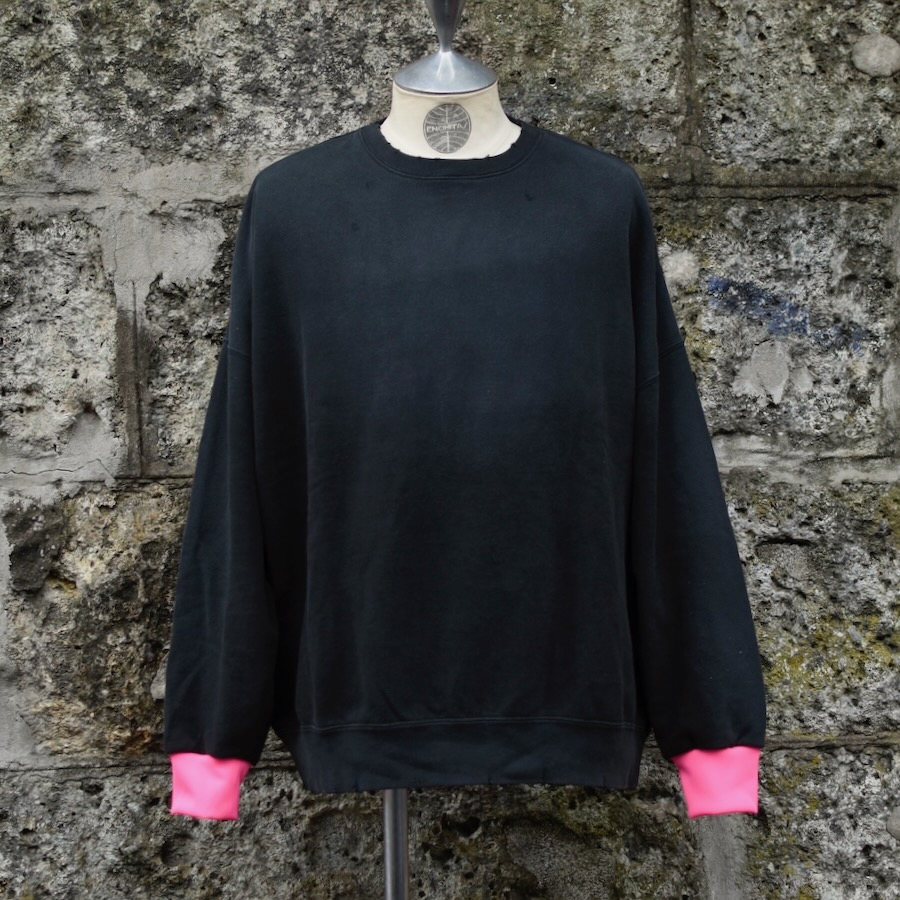 プルオーバータイプのスウェットに、バイオ加工、汚し加工、ダメージ加工とあらゆるアレンジを追加、ヴィンテージのような雰囲気を演出。さらに袖口はコーディネートの差し色になるような鮮やかなカラーリングのリブが装着されています。
