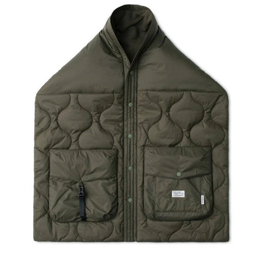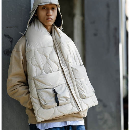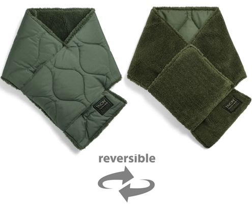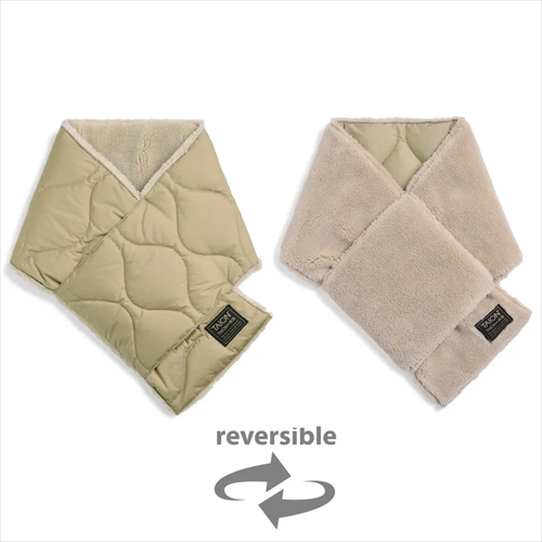 上質なダウンを封入したマフラーは、表地にキルティング、裏地にボアフリースを配置。両A面で使えるリバーシブルに仕上げ、先端を通すだけで着用できるシンプルな構造。