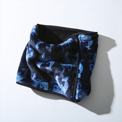 手描きのイラストを落とし込んだ総柄とは対照的に、裏面を無地に仕上げたリバーシブル。サイドのジップを使って簡単に身に着けられ、柔らかなフリースは心地良さが抜群。