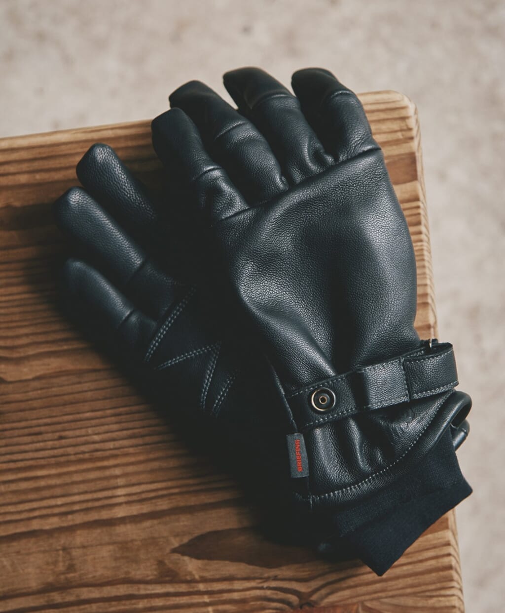 近年はキャンプシーンにおいてエルマーバイスワニーのグローブが注目を集めており、これにブリーフィングの要素を取り入れたレザーグローブは、アウトドア好きにもマストなアイテムとなっている。