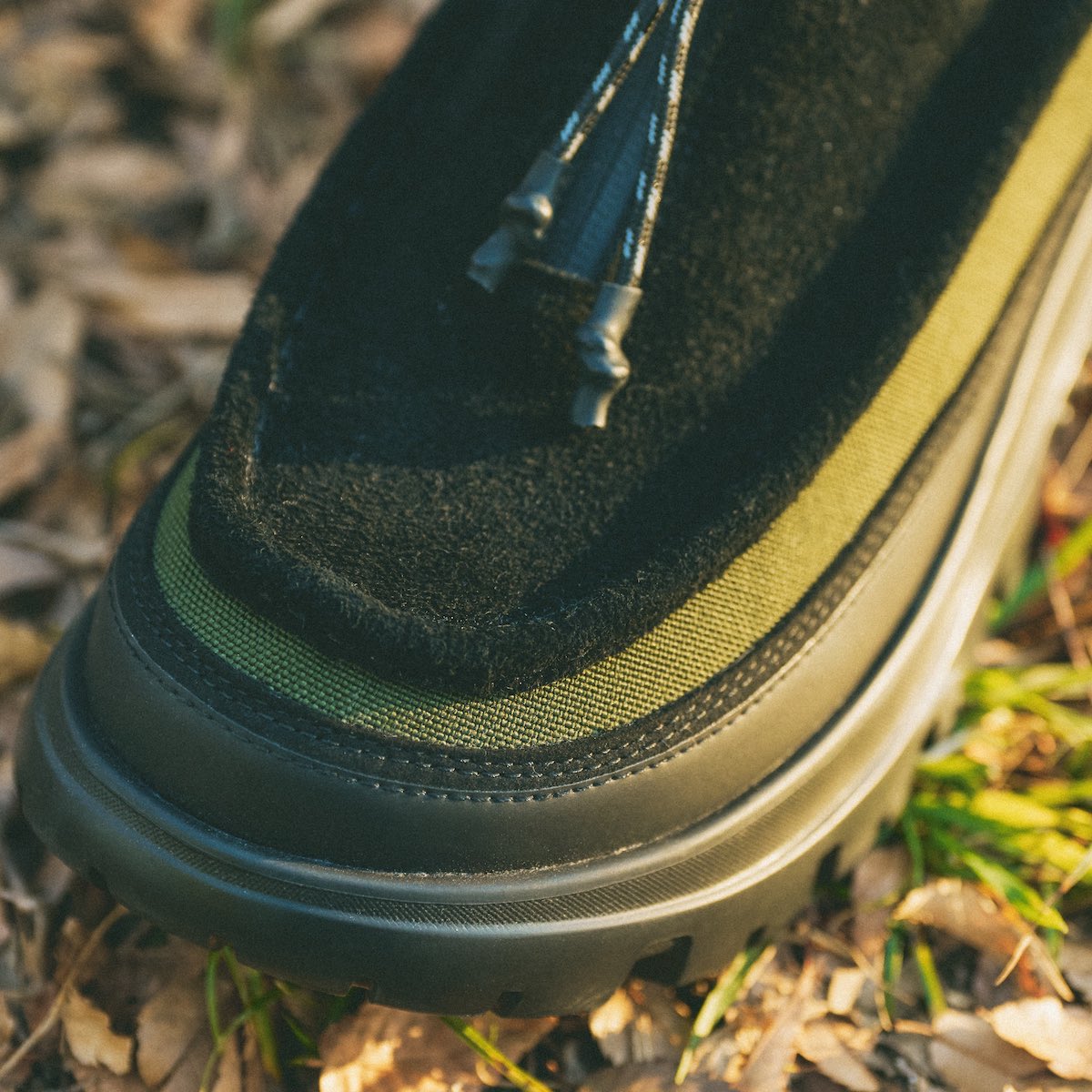 保温力に優れるボリューミーなアッパーとスムーズに着脱できるフロントジップを有し、軽量 EXソールのおかげで履き心地も文句なしの名品に、ブラックベースのアーミーカラーをオン。アウトドアで頼れる実用性をキープしつつ、アーバンにハマるスタイリッシュさまで獲得した。