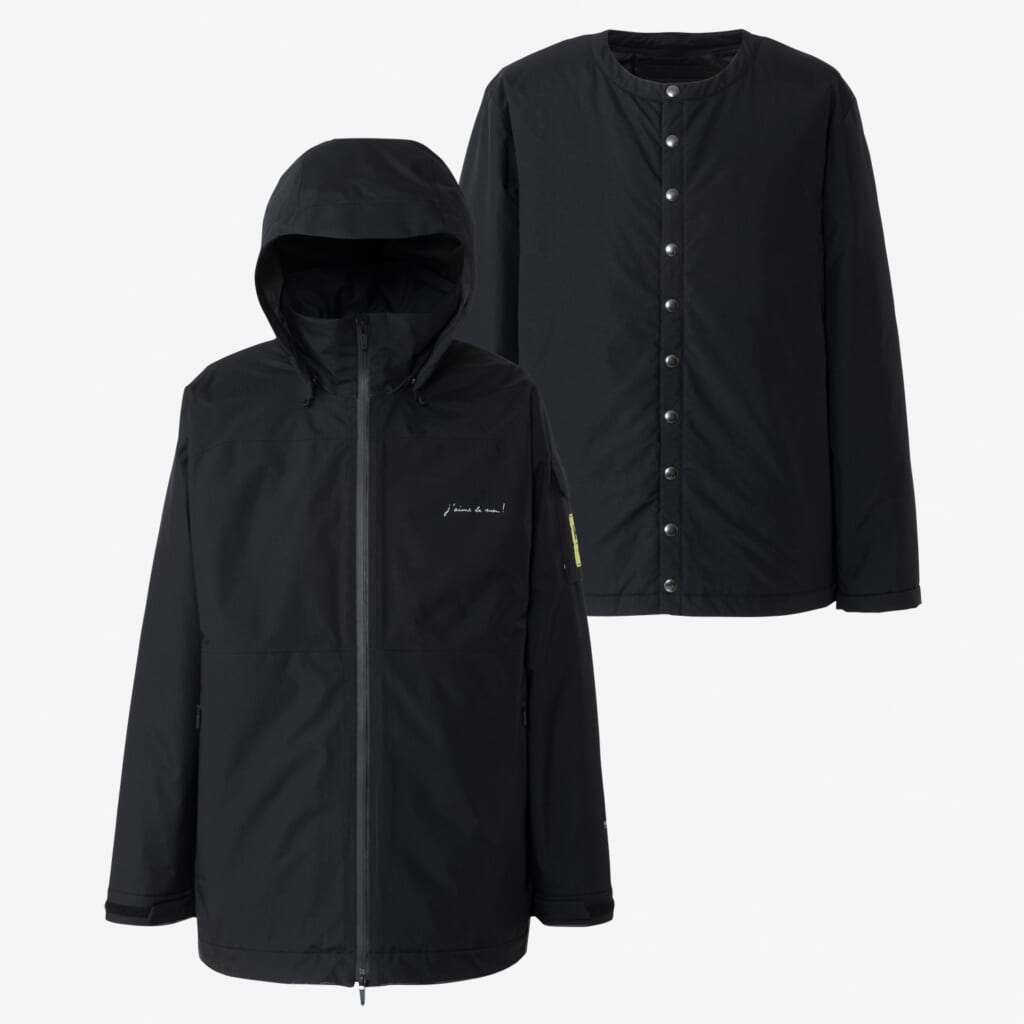 防水ジャケットとインサレーションカーディガンを組み合わせた、3WAY仕様のアウター。シェルには、糸の生産過程で発生する落ち綿を再利用したリサイクルナイロンが一部使用され、防水透湿性に優れた生地に仕上げられています。