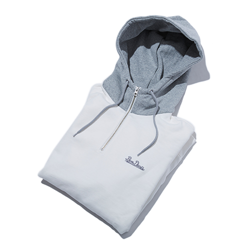 フードと身頃で配色を切り替えた、一枚で着てもサマになるスウェットパーカ。首元の保温性を高めるうえ、ハーフタイプのジップを開けるとベンチレーションに。