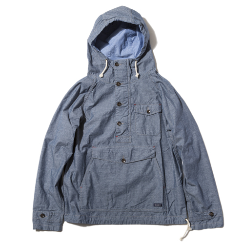 インナーとしても着こなせるシャンブレー生地のアノラック。フロントの大容量ポケットは2重構造に仕上げ、ちょっとした外出なら手ぶらで行動できるのが魅力。