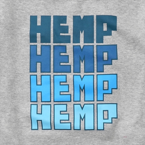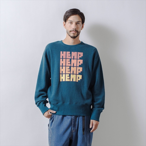某スポーツブランドのヴィンテージスウェットのように、“HEMP”のレタードをリピートしてプリント。マルチカラーに仕上げた背面の切り替えも注目。