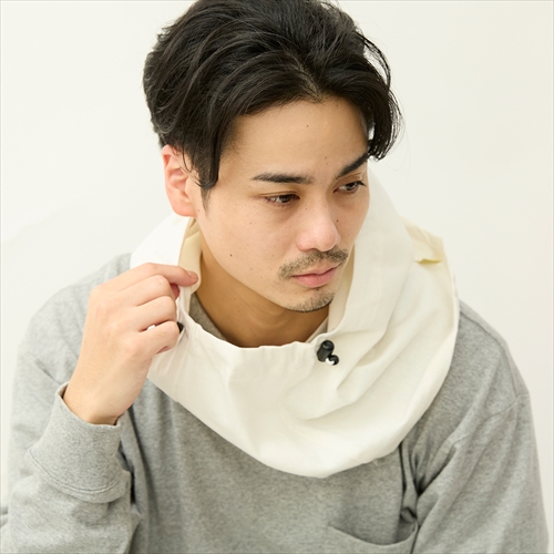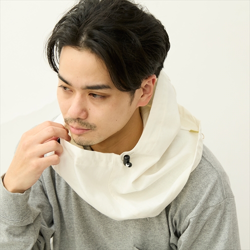 ボリュームのあるデザインで顔まわりを暖かく包み込むバラクラバ。フードにあしらったドローコードでフィッティングが調整できるのもポイント。