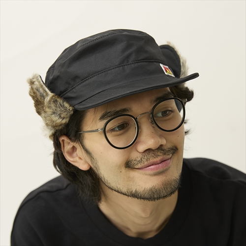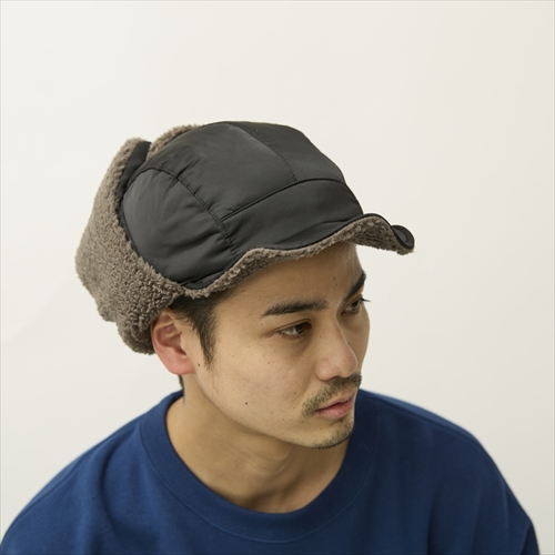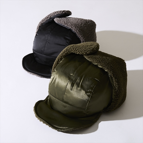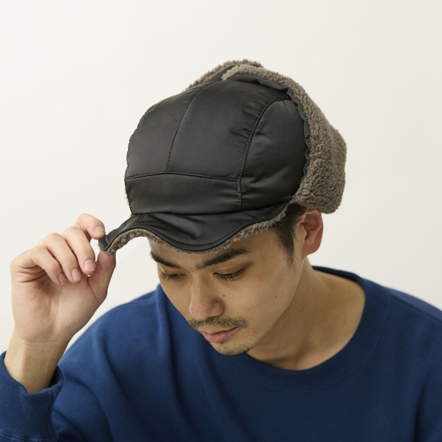 イヤーフラップだけでなくフロントパネルにも毛足の長いファーをレイアウト。ミリタリーキャップから着想を得た、男心をくすぐる無骨なデザインもポイント。