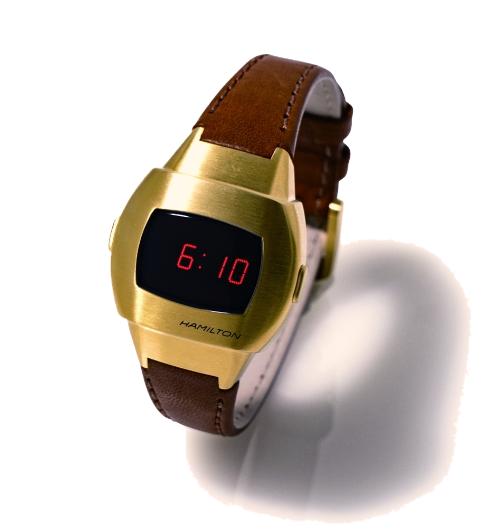 世界初のデジタル時計、ハミルトン パルサーを現代的に再構築。エレガントなイエローゴールドPVDケースにコニャックカラーの革ベルトを合わせ、存在感抜群。100m防水。¥138600