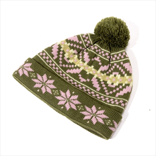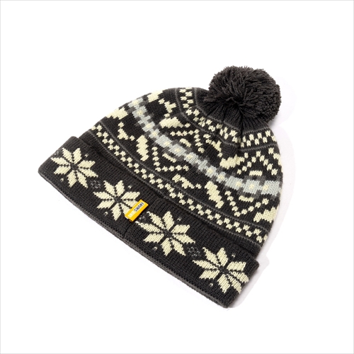 トップにボンボンを施したうえ、ノルディック柄を織り込んだレトロなデザイン。気軽に洗濯できるアクルリボディが使用され、サイドにイエロカラーのピスネームをオン。