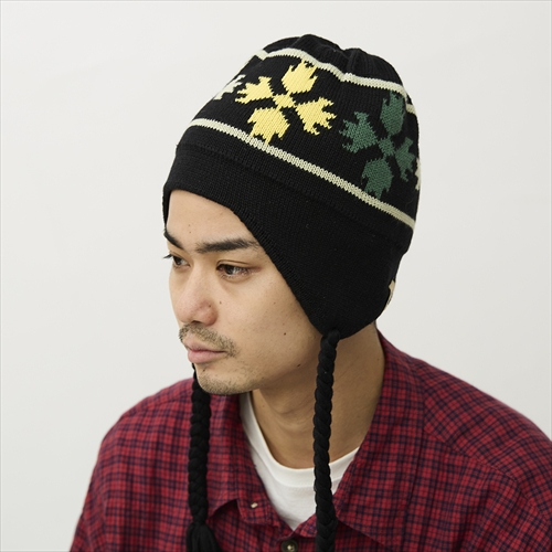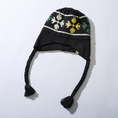 カラフルなモチーフとロープ状に編み上げたフラップをコンビネーション。スタイリングの主役になる存在感のあるビーニーに。
