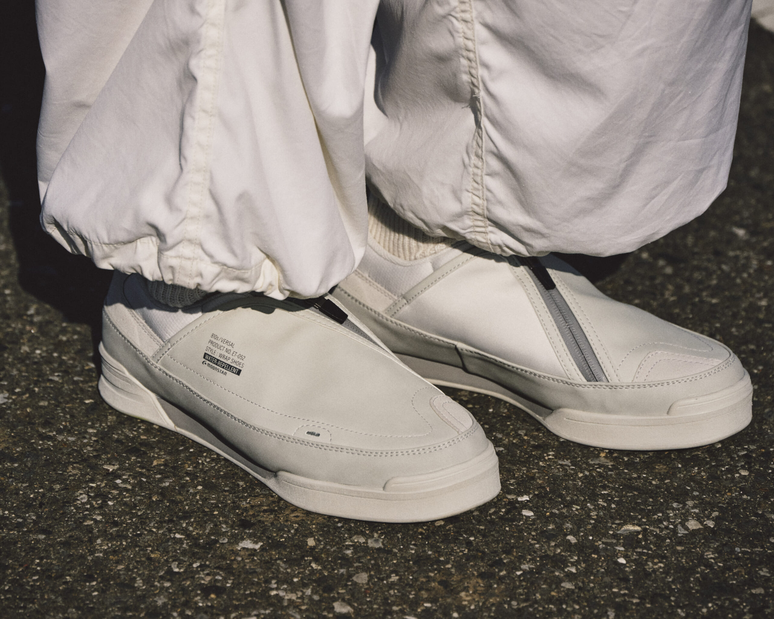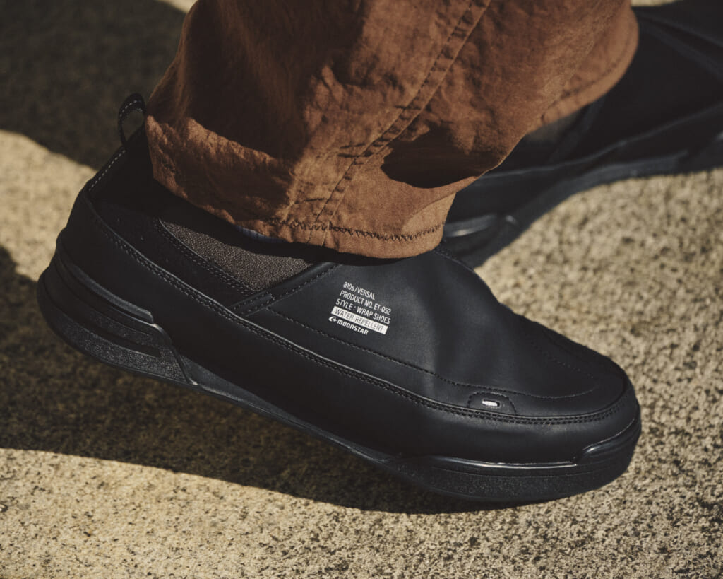 学生靴の丈夫さを引き継ぎながらスマートに仕上げたスリッポンタイプの“ヴァーサル”。防水フィルムを使ったアッパーには斜め方向にファスナーを設けている。オールブラック及びオールホワイトのワントーンカラーも相まってテック感が漂うモデルだ。