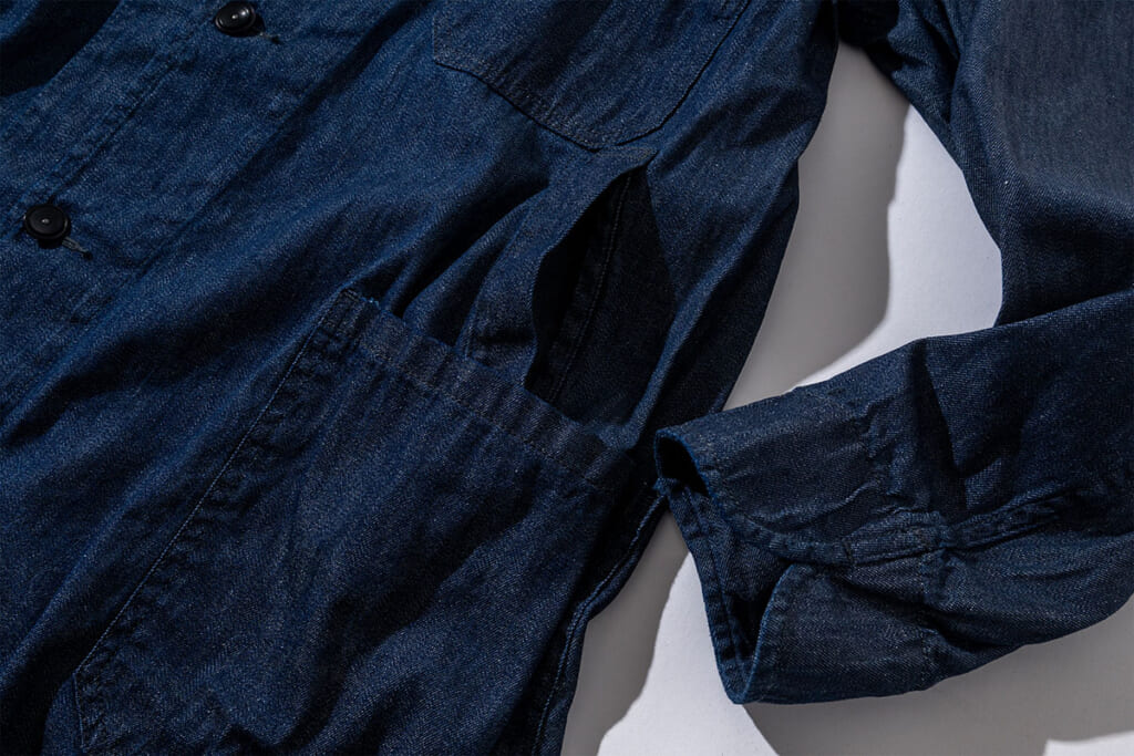 サイドに付けられたスラッシュポケットからは内側に着用したジャケットやパンツのポケットへ直接アクセスできる構造なので実用性も高い。さらに、動きやすさを考慮した深めのバックスリットや、巻き縫い仕様など、随所に堅牢性と機能性を備えた作りも印象的だ。