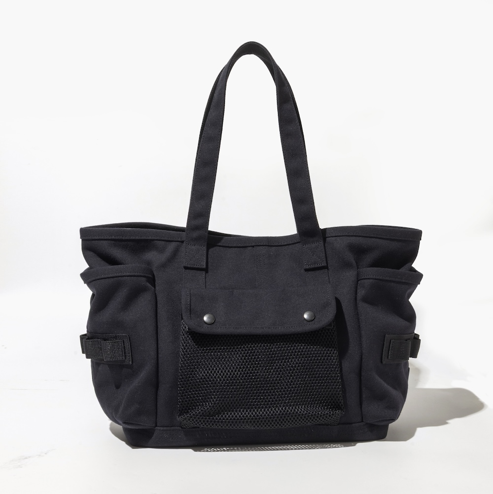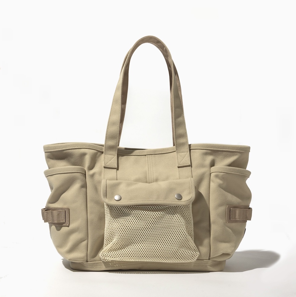 続いては、コラボレーションとしては初となるトートバッグ。デイパックと同様の生地を使用し、正面には視認性に優れたメッシュ素材のポケットが配置されています。