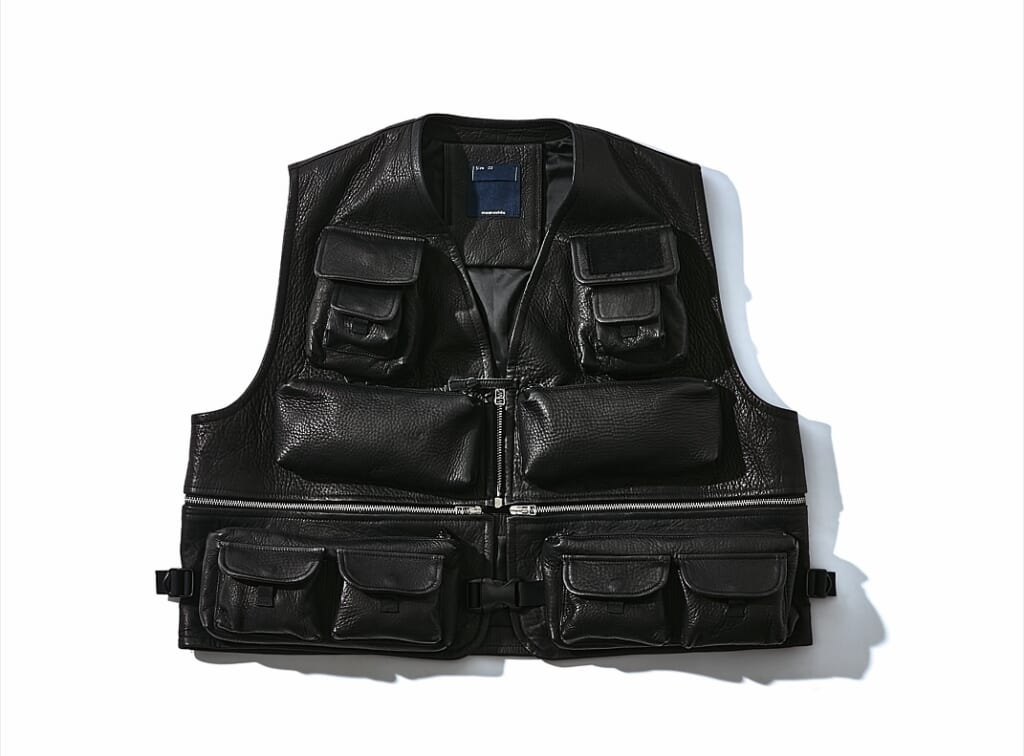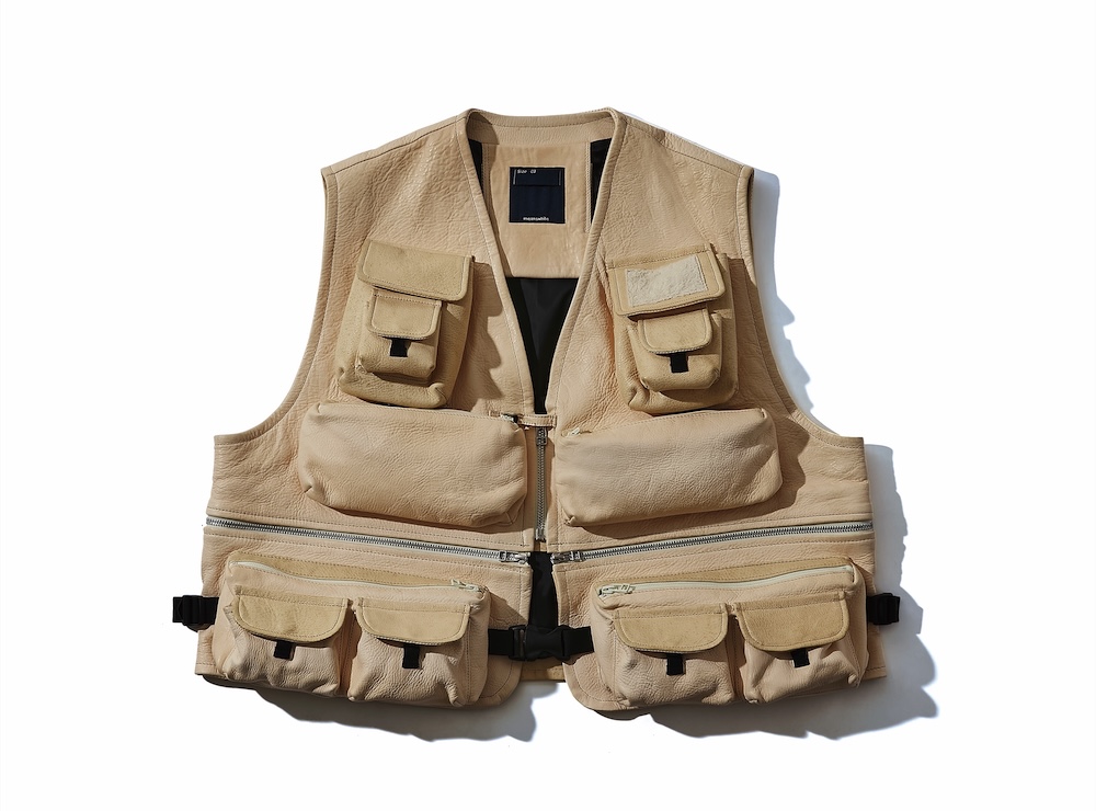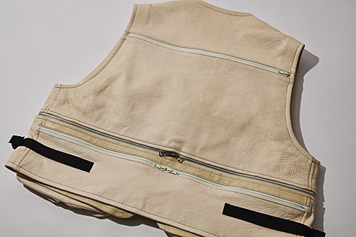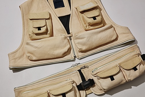 1000年以上の歴史を持つ兵庫・姫路の白鞣しした鹿革は、荒々しい質感のなかに繊細な表情を併せ持つ唯一無二の素材。フィッシングベストをモチーフとした大小さまざまなポケットワークが特徴で、バッグのように使用することができる。