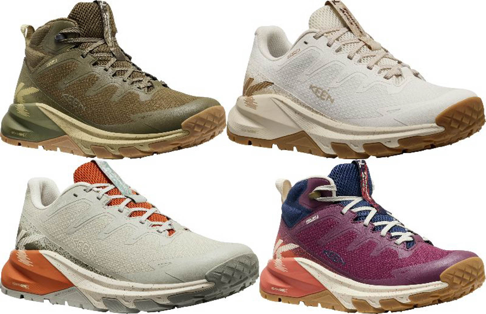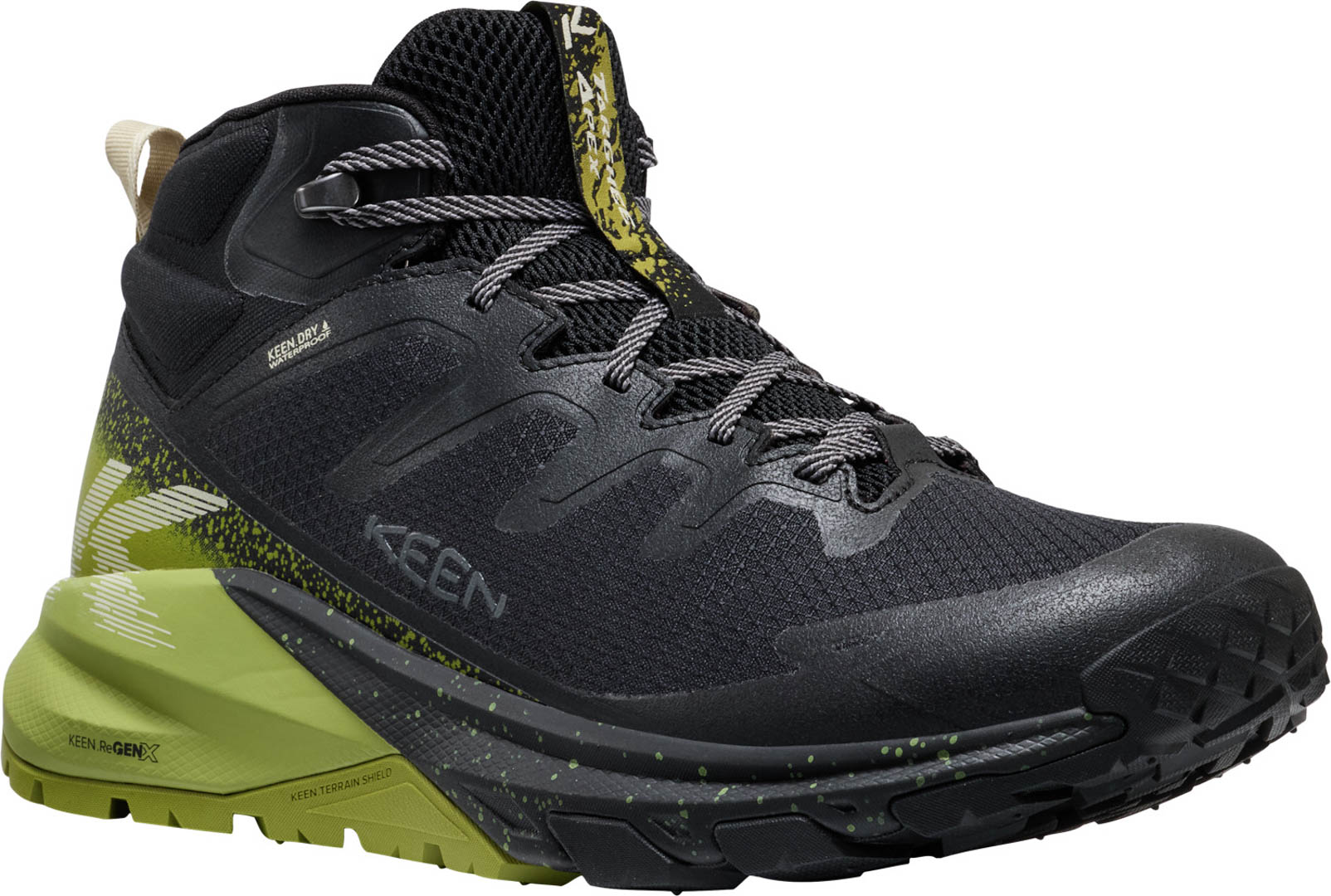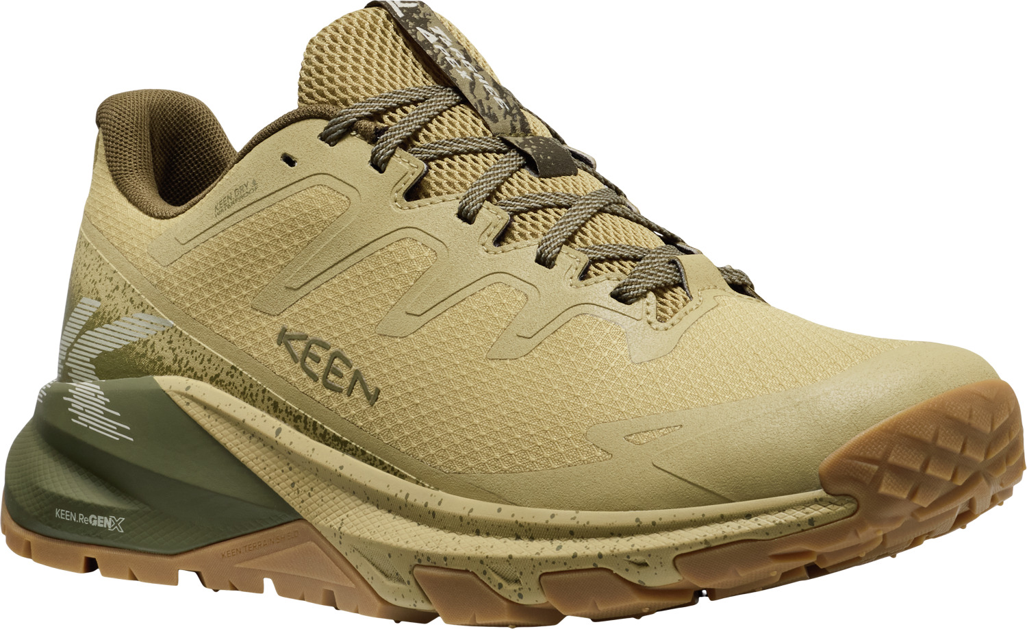 これまで長い年月をかけて積み上げられてきたターギーのノウハウや快適性を踏襲し、軽量で高反発な KEEN.ReGENX フォームを採用し、柔らかなクッション性とトレイルを歩くときに必要なサポート性と安定性を両立。柔軟性に優れたテクニカル的スタイルを採用したアッパーは、模様しやすい部分に耐久性の高いオーバーレイを配置して耐久性を高めた。