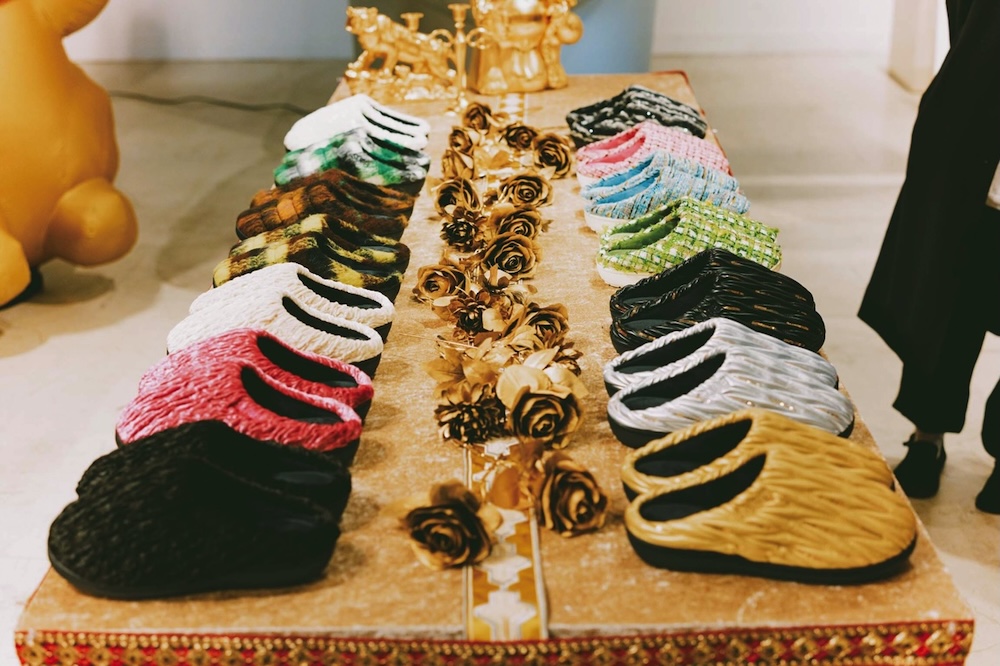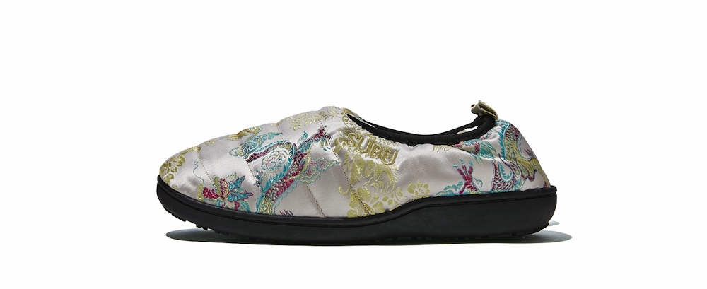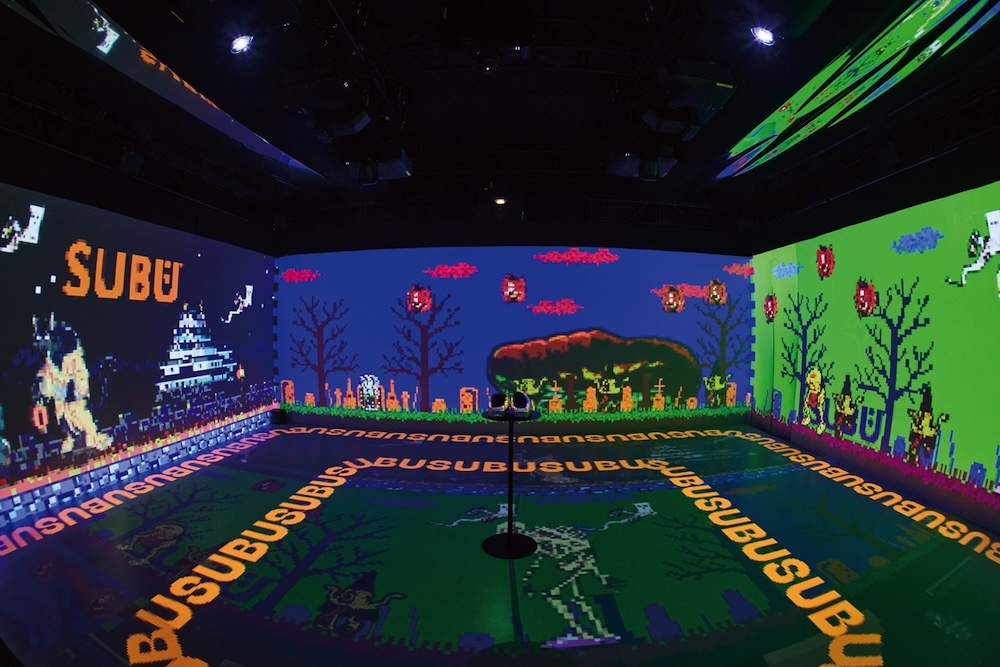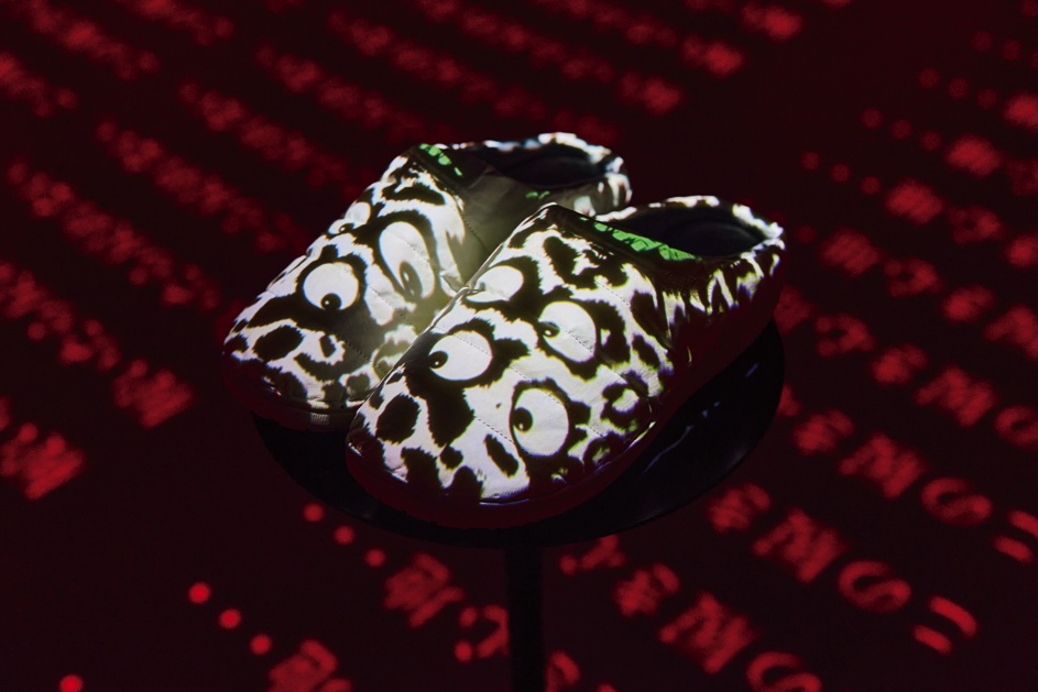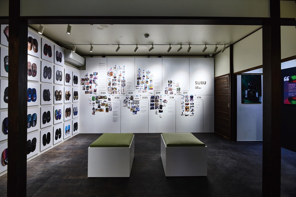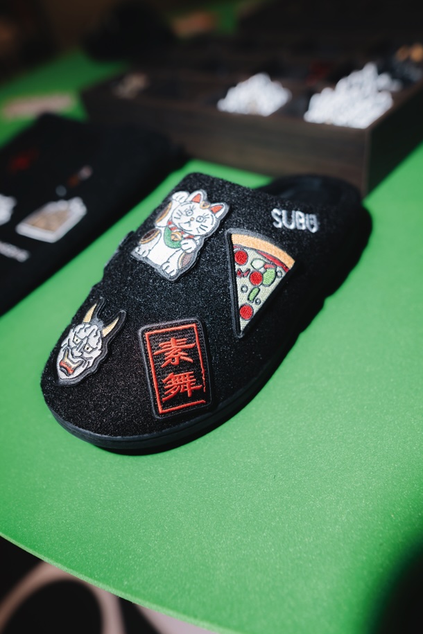 暗いなかを進むと、中央に置かれた1足のSUBUを覆うように360度のプロジェクションマッピングが! 空間はまだまだ続き、各部屋でさまざまな映像とグラフィックを楽しむことができた。また会場の最後にはショップが設けられ、定番アイテムや25AWコレクションのほか、POP-UP限定で今年の干支、午(うま)にちなんだ「干支SUBU」の販売もあった。