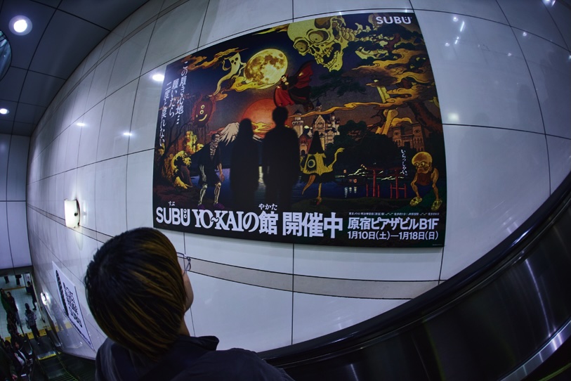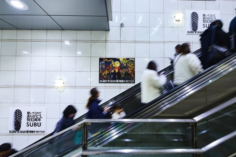 1月10日~18日、表参道の原宿ピアザビルB1Fで行われたPOP-UPは“履いたら二度と戻れない……”をコンセプトに、“SUBU×YO~KAI”の世界観を体感できるというものだった。ビルの地下に降りると、お化け屋敷のような入り口がお出迎え。