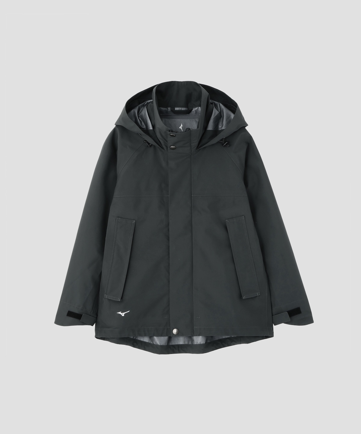 袖口は手の甲まで覆うカフ仕様で、立体的な大ぶりなフードと合わせて雨風をしっかりガード。機能性だけでなく、デザインのアクセントとしても効いている。