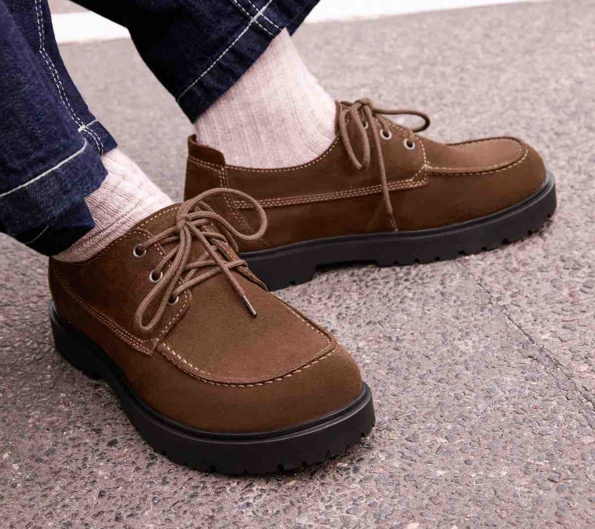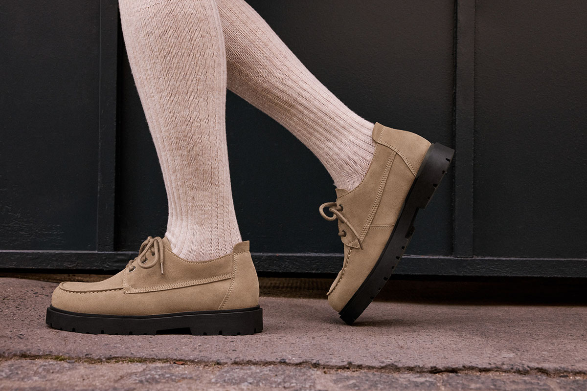 アッパーには上質なスエードレザーやグレインレザーを使用。履き込むほどに風合いが増し、週末のキャンプから平日の通勤まで幅広く活躍。グリップ力の高いアウトソールは、砂利道や芝生、アスファルトまで安定感のある歩行をサポートします。